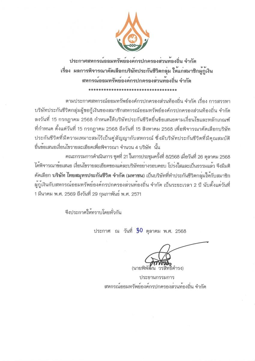 เรื่อง ผลการพิจารณาคัดเลือกบริษัทประกันชีวิตกลุ่ม ให้แก่สมาชิกผู้กู้เงินสหกรณ์ ฯ