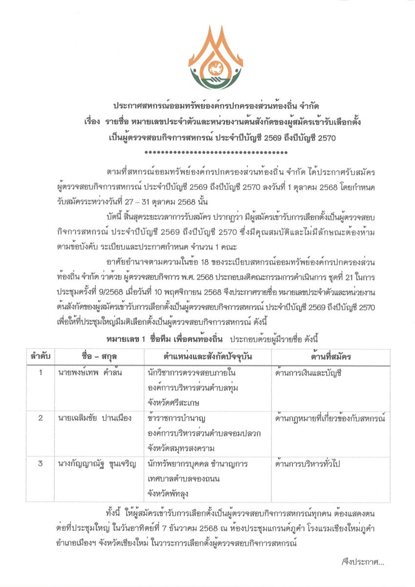 เรื่อง รายชื่อ หมายเลขประจำตัวและหน่วยงานต้นสังกัดของผู้สมัครเข้ารับเลือกตั้งเป็นผู้ตรวจสอบกิจการสหกรณ์ ประจำปี 2569 ถึงปีบัญชี 2570