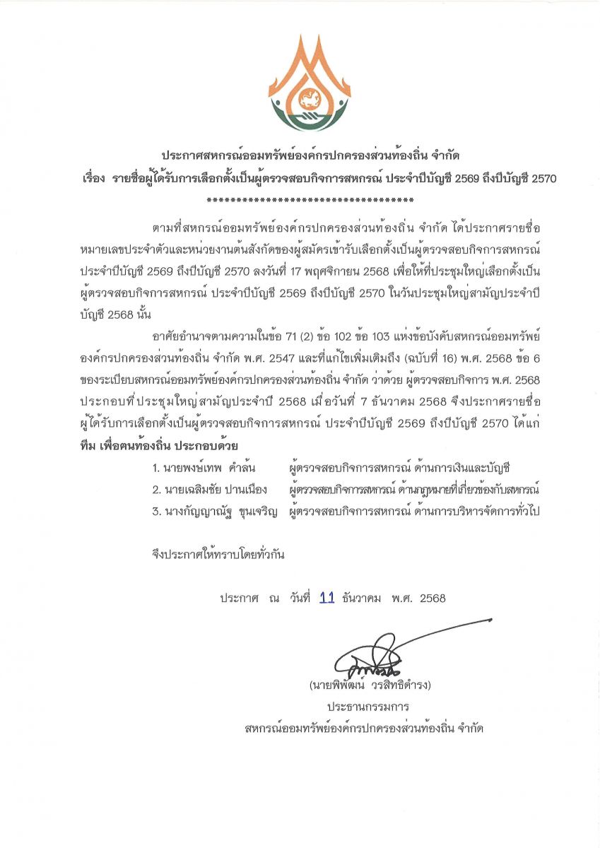 เรื่อง รายชื่อผู้ได้รับการเลือกตั้งเป็นผู้ตรวจสอบกิจการสหกรณ์