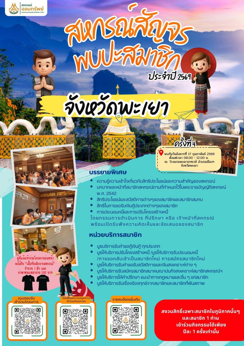 - ส่งแบบตอบรับภายในวันที่ 5 กุมภาพันธ์ 2569 ก่อนเวลา 16.30 น.(สงวนสิทธิ์เฉพาะสมาชิกในภูมิภาคนั้นๆ และสมาชิก 1 ท่านเข้าร่วมกิจกรรมได้เพียงปีละ 1 ครั้งเท่านั้น